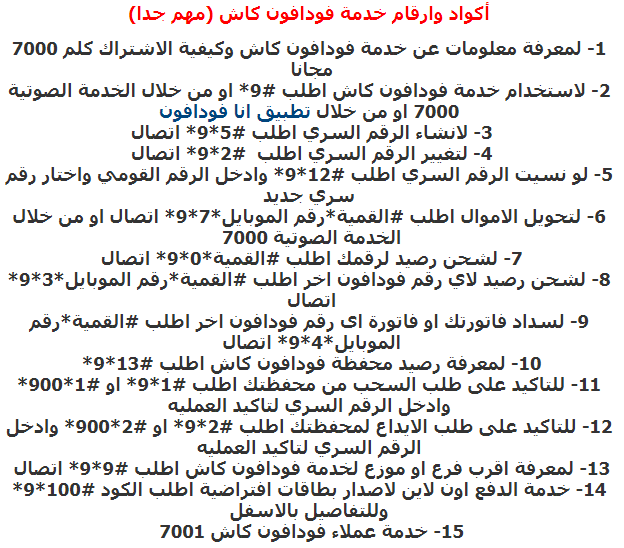 جميع أكواد خدمة فودافون كاش إشتراك سحب وايداع رسوم خدمة
